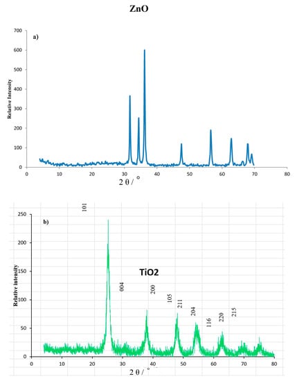 The XRD patterns of ZnO and TiO2 nanoparticles are illustrated in Figure 2a,b. Both patterns show the characteristic peaks of ZnO and TiO2. The diffraction peaks of ZnO powders according to the standard pattern (JCPDS No. 04-008-4400) at 2θ values of 31.77°, 34.4°, 36.2°, 47.5°, 56.6°, 62.8°, 66.3°, 67.9°, and 69.1° were indexed to the crystal planes of (100), (002), (101), (102), (110), (103), (200), (112), and (201), respectively, as shown in Figure 2a. No characteristic peaks of any impurities were detected, confirming that the obtained ZnO nanoparticles have high quality, while the diffraction peaks of the TiO2 powder appeared at 25.3°, 37.8°, 48.0°, 54.0°, 55.1°, 62.7°, 68.8°, 70.3°, and 75.1°, which corresponded to the crystal planes of (101), (004), (200), (105), (211), (204), (116), (220), and (215), respectively, for TiO2 according to the standard pattern (JCPDS 01-75-2547), as shown in Figure 2b. The average crystallite sizes (d) of ZnO and TiO2 NPs were estimated by using the Debye-Scherrer equation:
