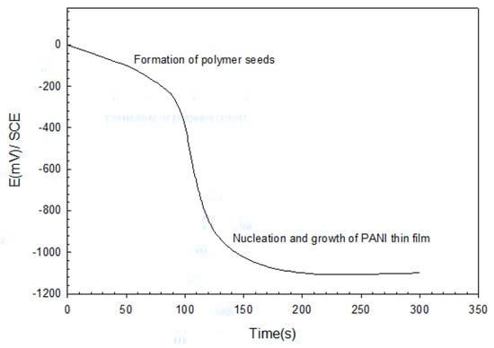 The mode of the galvanostaic technique for PANI deposition is illustrated in Figure 4, which shows the variation of potential with deposition time at a constant current density (6 mA/cm2). It can be seen that the initial variation in the electropolymerization curve was due to the nucleation and growth phenomenon. Nucleation started with the formation of polymer seeds on the ITO surface. After about 25 s, a fait green-color layer of PANI was observed. At ~125 s, a dark green-color film was formed, indicating the formation of PANI on ITO.