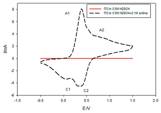 All electrochemical measurements were carried out in a three-electrode electrochemical cell connected to a computerized potentiostat/galvanostat (Iviumstat, Eindhoven, The Netherlands). The deposited cell was composed of an ITO (2 × 2 × 1.1 cm3) as a working electrode, Pt foil as a counter electrode, and (Hg/Hg2Cl2, SCE) as a reference electrode. Before the electrochemical deposition of PANI, ITO was pretreated in a free monomer (0.5 M H2SO4) solution by sweeping the potential between −0.5 and 1.5 V and SCE for different numbers of cycles at a scan rate of 0.1 mV/s using a CV technique. The electrochemical polymerization of aniline on an ITO electrode was performed using the CV technique in the electrolyte solution of 0.5 M H2SO4 containing 0.1 M aniline for different numbers of cycles. When the electropolymerization was taking place, the color of the ITO changed from transparent to green, revealing the formation of the PANI film.
