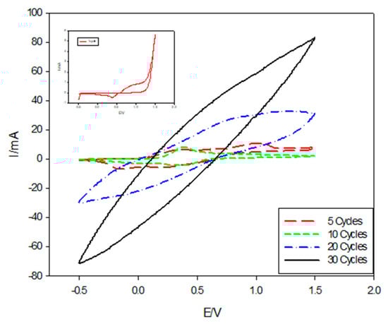 The effect of cycle numbers on the deposition of PANI using the CV technique at a scan rate of 0.1 mV/s with a potential range of −0.5 to 1.5 V/SCE has been investigated, as shown in Figure 6. The cyclic voltammogram curve obtained during the first cycle (inset in Figure 6) revealed that, in the positive direction, the increase in the current density at (0.38 V) was due to the oxidation of the monomer, while the current increase in the negative direction at (−0.4024 V) was due to the initial stage of the nucleation of the polymer film. The cyclic voltammogram of ITO in the acidic solution containing aniline monomer was recorded for 5, 10, 20, and 30 successive cycles. It can be seen that, the redox charge of PANI film continued to grow by the repetition of potential cycling. The cathodic charge increased linearly with the number of potential cycling. This indicated that the building of PANI film was proportional to the number of potential cycles.