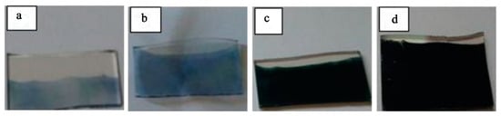 The photographs of the PANI films electrodeposited at different numbers of deposition cycles (5, 10, 20, and 30) on the ITO glass are shown in Figure 7. It can be seen that the PANI thin layer (emeraldine base) was deposited on the glass. Further increase in the number of cycles showed that the thickness of the PANI layer had a remarkable increase, and the color of PANI film became darker and darker. The PANI film electrodeposited at 30 cycles was in dark green (Figure 7d).