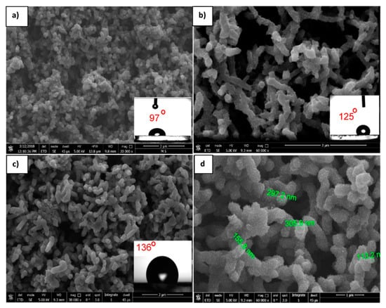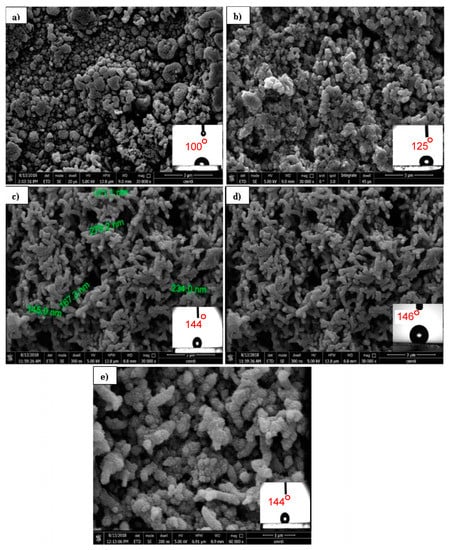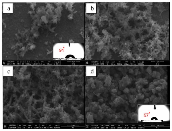 When measuring the CA for the as-prepared surface, it was determined to be 100°, 125°, 144°, and 146° for 0.03, 0.125, 0.225, and 0.4 g/L TiO2, respectively, as shown in Figure 10a–d. This result indicated that the PANI coating is intrinsically hydrophobic (CA = 100) even at the lowest concentration of TiO2. Moreover, at the highest concentration of TiO2 (0.4g/L), the CA reached 146°, which is practically considered superhydrophobic as previously mentioned [7]. Figure 11d (higher magnification of Figure 11c) shows a nanoscale hair-like feature on the top of the fibers. This type of hierarchical structure plays a major role in enhancing the hydrophobicity. It has been suggested that the polymerization of PANI on heterogeneous micro- and nanostructured surfaces gives rise to non-uniform coatings [53].