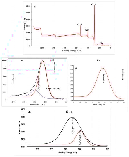 XPS analysis was used to determine the chemical composition of PANI thin films polymerized at different cycling potentials (–0.5 to 1.5 V) for 30 cycles (optimum condition). The full survey of XPS for PANI thin films is displayed in Figure 9a. The XPS survey scan shows the presence of oxygen (O1s at ~532 eV, nitrogen (N1s at ~399 eV), carbon (C1s at ~285.03 eV), as well as sulfur (Sl2p at ~168.34 eV). Oxygen in an emeraldine-base PANI can emerge from the partial oxidation of the film surface or from weakly complexed oxygen atoms [56]. Carbon and nitrogen were assigned to the spine of PANI, whereas the sulfur was a counter ion in the case of protonated PANI samples or originated from the supporting electrolyte (H2SO4) that was utilized for the deposition process. From Figure 9b (analysis of C peaks), three peaks were observed at 284.84, 285.92, and 287.54 eV, and can be attributed to C–C, C–O, and C=O, respectively. The spectrum survey contains a high-intensity peak centered at 285.92 eV, which has an insignificant asymmetric broadening towards high binding energies due to an incorporation of the protonation of imine and amine sites. Small, high binding energy tails (BE = 287.54 eV) are due to the π–π* bonding band, which has a long-range order with a polymer chain. The most nitrogen atoms are in the amine state with a 399.5 eV binding energy in the benzenoid amine group.