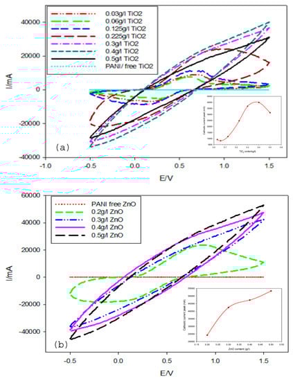 Figure 10 shows the CV plots of PANI/TiO2 and PANI/ZnO thin film composites coating deposited at a scan rate of 0.1 mV/s in the potential range of –0.5 to 1.5 V/SCE for 30 cycles and with different nanoparticles contents. The results revealed that the redox currents increased with increasing the particle contents in the electrolyte. From the cyclic voltammogram curves (Figure 10a,b), it can be seen that the cathodic current increased regularly with an increasing the content of TiO2 in the solution. However, suddenly, the redox current decreased at certain contents of TiO2 (0.5g/L), which indicated that the optimum concentration of TiO2 was 0.4g/L (inset in Figure 10a). Additionally, in the case of the PANI/ZnO nanocomposite, the cathodic current increased gradually with an increasing the content of ZnO.