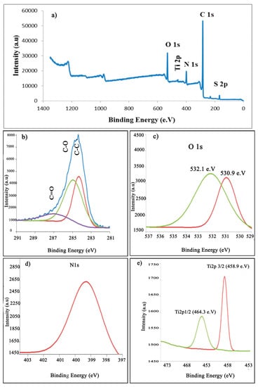 The formation of PANI/TiO2 nanocomposite formed at cycling potentials (–0.5 to 1.5 V) for 30 cycles with different TiO2 concentrations was further confirmed utilizing XPS analysis, as shown in Figure 13. It is clear that there was a peak for Ti, confirming the presence of Ti species in the composite. The XPS spectra of Ti2p (Figure 13e) show two peaks at 458.97 and 464.59 eV, corresponding to Ti2p3/2 and Ti2p1/2 spin orbital splitting in the Ti 4+ chemical state. This result is in strong agreement with the result by Li et al. [59]. The Ti2p1/2 peak is broader than the Ti2p3/2 peak at the moment, and this phenomenon, the Coster–Kronig effect, has appeared often in the literature [60]. Red shifts toward a high binding energy were far from the pure TiO2 (452.92 and 464.89 eV). This binding energy shifts could be due to a change in the chemical state or electronic interaction between the PANI surface and the TiO2 nanoparticles [61]. From Figure 13b and Figure 14b, three peaks located at 284.31, 284.9 and 286.94 eV were observed and can be attributed to C–C, C–O, and C=O, respectively.