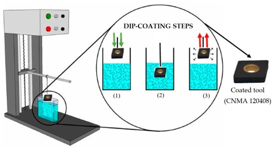 The machining is one of the most applicable processes in the manufacture of metals. For this reason, different researchers have focused their efforts on tool improvement and optimization of cutting parameters []. Indeed, it is necessary to choose the cutting parameters correctly to decrease the wear and consequently increase the tool life. Tooptong et al. [] affirm that the rise in the cutting temperature due to the increase of the cutting speed leads to the degradation of the cutting tool material. Thus, different coating techniques have been developed to improve the resistance of the tool, such as chemical vapor deposition (CVD) [], physical vapor deposition (PVD) [,] and sol-gel [,], allowing the fabrication of different coating materials.
