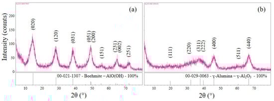 The X-ray diffraction of the aluminium oxide is illustrated in Figure 2. Figure 2a shows the sample without heat treatment. It was observed that the diffraction peaks coincided with the boehmite phase-AlO(OH). Besides, Figure 2b displays the sample after heat treatment of 450 °C indicating that this phase disappeared, highlighting some peaks which coincided with the ɣ-Al2O3 pattern. These results indicated that the de-hydroxylation of the boehmite phase occurred, which transformed into ɣ-Al2O3, as expected at this temperature. Indeed, according to Chen et al. (2000) [], the ɣ-Al2O3 phase consolidates from 380 °C. The broad peaks are due to the small size of the nanocrystals formed during the sol-gel deposition. In particular, the broad band observed between 20° and 43° in Figure 2b results from the overlapping of three small peaks of the ɣ-Al2O3 phase indicated by the literature (Joint Committee on Powder Diffraction Standards (JCPDS) card number 00-029-0063 illustrated in Figure 2b).
