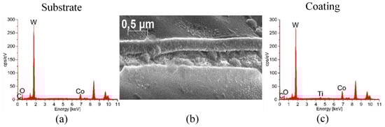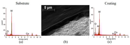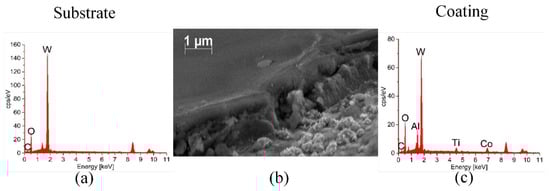 Figure 5 shows an SEM image of the multilayer coating deposited on the WC substrate together with the EDS spectra taken in the substrate and coated regions of the tool. It can be seen that the coating showed good adhesion on the WC substrate. Obviously, the EDS spectrum from the substrate showed the same results than the two previous characterizations registered indicating one more time the elements of the WC substrate composition. Nevertheless, the EDS spectrum from the coated region exposed additional peaks characteristic of the Ti, Al and O elements, corresponding to the chemistries of the multilayer coating.