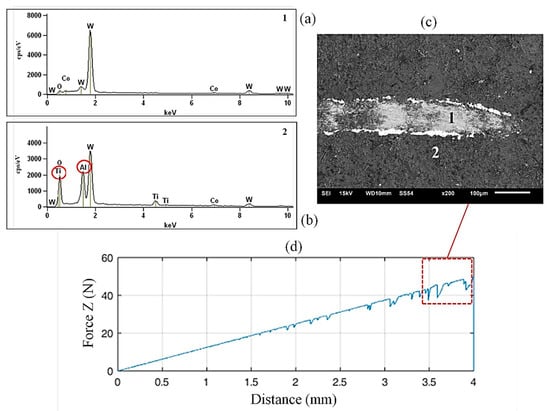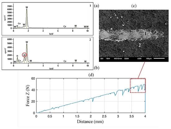 (a) EDS spectrum from the substrate region, (b) EDS spectrum from the Al2O3 coating, (c) SEM image of the scratch test on the sample with Al2O3 coating, (1) region without Al2O3 coating and (2) region with Al2O3 coating, and (d) Z-force versus distance for scratch test of the Al2O3 coating.