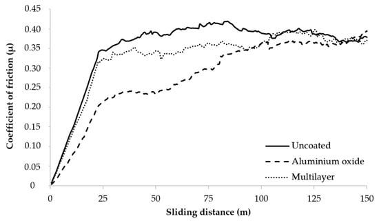 The behavior of the coefficient of friction (µ) for uncoated, aluminium oxide and multilayer coating tools versus sliding distance is shown in Figure 8.