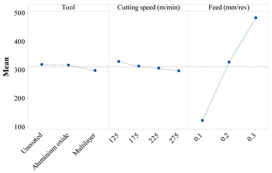Figure 9 illustrates the behavior of the cutting force as a function of the various levels used. The most influent parameter was the feed. The larger cutting efforts are necessary to remove larger amounts of material. The friction at the tool/chip and tool/workpiece interfaces is minimized with the use of coated tools, which proves that the lowest cutting force will be reached using the multilayer insert. Such a statement can also be confirmed by the results of tribological tests. As cited by Trent and Wright [], when using the coating on cutting tools can be obtained lower forces.