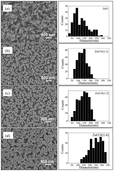 Left: electronic micrographs of (a) ZnO (1:0), (b) ZnO:N (1:1), (c) ZnO:N (1:2), and (d) ZnO:N (1:4); right: the corresponding NRs diameter distribution obtained through the software ImageJ.