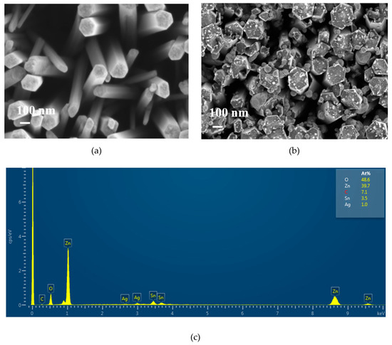 Figure 3a,b shows typical scanning electron images of as-synthesized pure ZnO and ZnO:N (1:2) NRs after the Ag photodeposition process, respectively. The presence of nanoparticles on the ZnO:N (1:2) NRs is clearly noticeable in Figure 3b. Figure S5 shows an SEM images obtained with an energy selective backscattered electron detector (EBS) of sample ZnO:N (1:2) in the same position of as show in Figure 3b, the color contrast difference on ESB analysis clearly indicates that the elemental composition of nanoparticles differ from the ZnO rods. Figure 3c depicts the EDS spectrum corresponding to the region of the film shown in Figure 3a (ZnO-Ag NRs), indicating that silver is present in this system. EDS and ESB analysis confirm that nanoparticles are indeed silver nanoparticles. Silver was deposited in the form of nanoparticles on the top and lateral faces of the ZnO:N rods, but in the case of the pure ZnO rods, although it is detected by EDS, cannot be identified as well-defined particles. To determine the reason of this behavior a deeper study of this phenomenon is necessary. Very likely, it is consequence of the presence of a higher amount of thick rods in the ZnO:N samples.