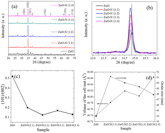 The ZnO and ZnO:N NRs films shown: (a) the diffraction patterns, (b) an enlarged view of the diffraction peak associated to the crystalline plane (002), (c) relative intensity ratio of (101)/(002) peaks, and (d) volume of the unit cell and grain size.