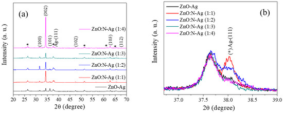 (a) XRD patterns of Ag-decorated undoped and ZnO:N NRs with different nitrogen contents in the seed layer; (b) enlarged view of the FTO peak shown in Figure 5a.