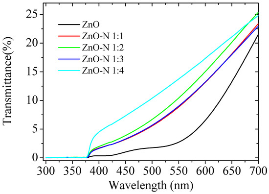 The optical transmittance spectra of the ZnO and ZnO:N NRs films were recorded over the spectral range of 300–700 nm and are shown in Figure 6. In general, the transmittance was below 15% (at λ = 550 nm) for all samples and the lowest transmittance was for undoped ZnO, the results of this analysis for the different samples are summarized in Table 1. The onset of the absorption edge (see Table 1, the supplementary material and references [38,39] for further details). The average transmittance increased with doping, likely due to an increase in the axial order of the synthesized ZnO:N NRs.