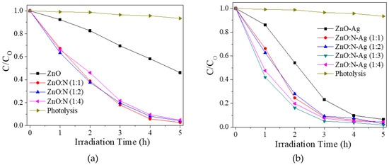 Variation of the photocatalytic efficiency of (a) pure ZnO and ZnO:N NRs and (b) ZnO-Ag and ZnO:N-Ag NRs. Uncertainty associated with each measurement is 5%.