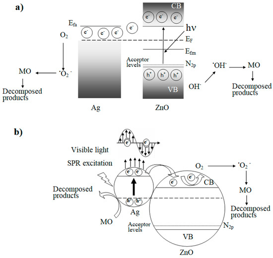 On the other hand, the increase of photoactivity in the visible range can be rationalized with the mechanism described in Figure 8b. Where plasmon resonance under visible radiation produces on the silver nanostructures a promotion of charge carriers [43,44,45,46], adding the fact that the Schottky interfacial barrier would prevent the transfer of an electron from the surface of the silver nanostructure to the semiconductor. However, it has been shown that electrons are still able to be transferred back from the Ag to the ZnO:N due to the strong collective oscillation of electrons under the plasmon excitation [47,48,49]. As in the previous case, the photogenerated superoxide •O2– and hydroxyl •OH radials would be generated and react with the MO.