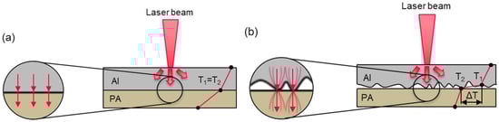 Figure 3 shows a simplified illustration of the hypothesized thermal-energy transfer of the irradiated laser beam across the interface in the case of (a) ideal flat surfaces and (b) across rough ablated Al surfaces in contact with smooth PA modeling “real life” conditions. The presence of surface asperities at the interface causes the thermal transfer by conduction to take place mostly at the points of contact [