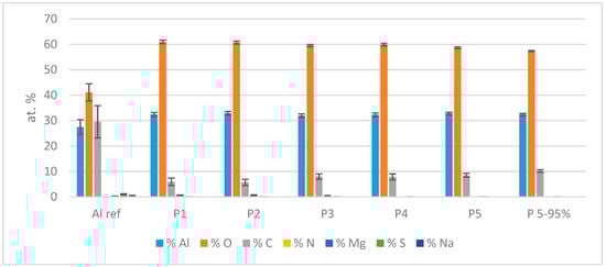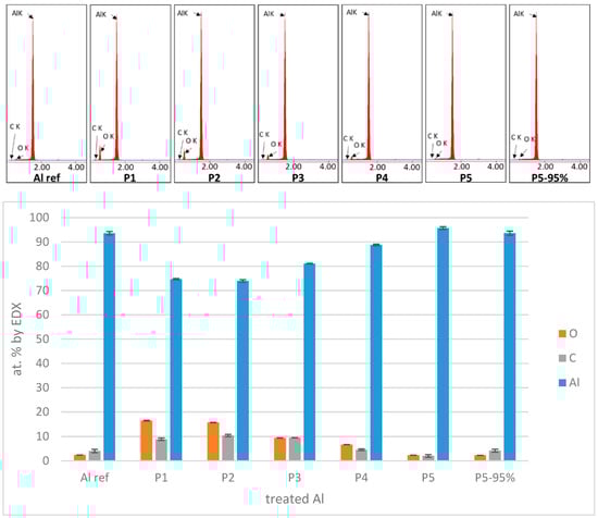 EDX spectra were obtained in the SEM with an EDAX GENESIS XM 4i energy-dispersive X-ray spectrometer (EDX, Mahwah, NJ, USA). The analytical distance used for X-ray measurement was 10 mm, which corresponded to a take-off angle of 35°. The measurement was performed at a pressure of 3 × 10−4 Pa (water vapor) and an accelerating voltage of 15 kV. A 0.15 × 0.13 mm2 area was scanned and an average spectrum was obtained on the whole area. The elemental composition is calculated from this spectrum, assuming the sample is only composed of aluminum, oxygen, and carbon. This assumption is made after observing the whole EDX spectra and identifying the peaks exhibiting a significant height.