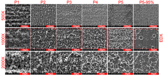 A pressure-controlled FEI Quanta FEG 200 scanning electron microscope (SEM) from FEI Company (Hillsboro, OR, USA) was used in secondary electron mode, in order to get information about the samples’ morphology. The acceleration voltage was generated at 15 kV. Six regions of 1 cm2 area were ablated on an Al sample. The sample conductivity was enhanced by depositing a fine layer of conductive lacquer in contact with the untreated aluminum part of the sample. The area that was coated by this lacquer was not observed.