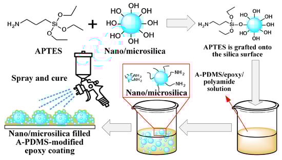 Reaction schemes of APTES-modified silica and the preparation procedure of the silica-filled A-PDMS-modified epoxy coating.