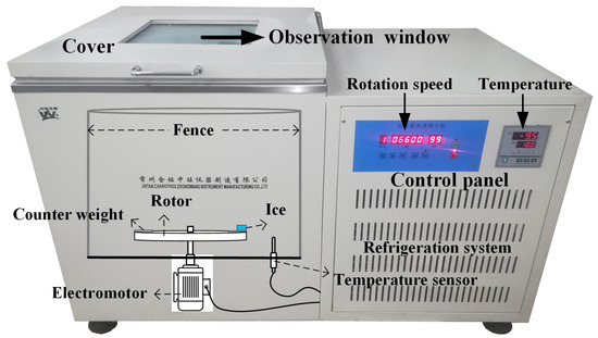 The ice adhesion strength (τice) was measured using a homemade refrigerated centrifuge (max rotation speed: 20,000 rpm, lowest temperature: −30 °C) (see Figure 2), and the centrifuge test is similar to those previously reported [14,16]. The rotor and electromotor are inside. All ice adhesion strength tests were performed inside this apparatus.