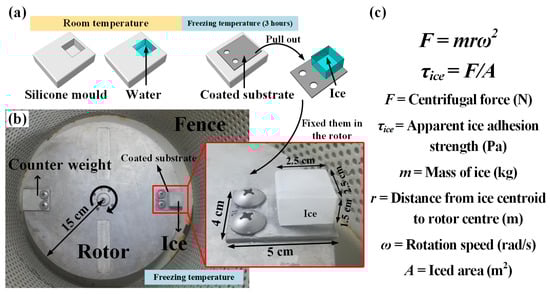 Schematic description of ice formation and centrifuge ice adhesion strength test. (a) Silicone mould was filled with deionized water. Substrate was placed upside down on the silicone mould and fully contacted with water. Temperature was set to desired temperature. After freezing, the substrate with ice was pulled out; (b) Substrate with ice was bolted to the discal rotor of centrifuge setup; (c) Formula for calculating the ice adhesion strength (τice).