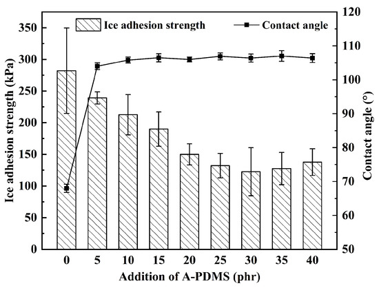 Ice adhesion strength (τice) (−10 °C) and CA of A-PDMS-modified epoxy coatings. The error bar is one standard deviation.