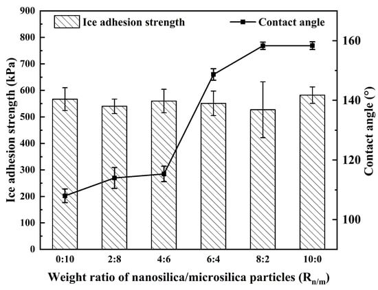 The particle size combination (Rn/m) effect on ice adhesion strength and hydrophobicity was investigated. It was found that the particle size combination obviously affects hydrophobicity. Under a suitable combination of nano/microsilica, the CA exceeded 150°. However, there was no significant correlation between τice and Rn/m. The τice of all nano/microsilica-filled coatings was much greater than that of coatings with no silica due to mechanical interlocking between the ice- and nano/microsilica-filled coatings.