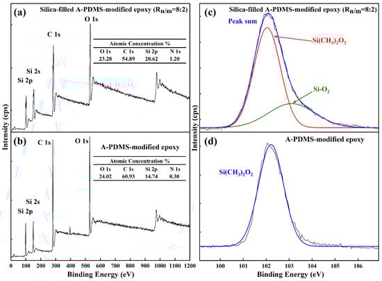 The wide-scan XPS spectrum of the (a) nano/microsilica-filled A-PDMS-modified epoxy coating (Rn/m = 8:2) and the (b) A-PDMS-modified epoxy with no silica. Atomic concentrations are shown in the insets. (c) High-resolution XPS spectrum of Si 2p of the nano/microsilica-filled A-PDMS-modified epoxy coating (Rn/m = 8:2) and the (d) A-PDMS-modified epoxy with no silica.