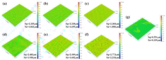 3D-Surface profiles and roughness parameters (Sa and Sq) of the nano/microsilica-filled A-PDMS-modified epoxy coatings: (a) Rn/m = 10:0; (b) Rn/m = 8:2; (c) Rn/m = 6:4; (d) Rn/m = 4:6; (e) Rn/m = 2:8; (f) Rn/m = 0:10. (g) A-PDMS-modified epoxy coating without silica.