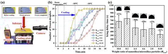 Freezing statistics experiment. (a) Scheme of freezing delay experimental set-up. (b) Statistics of freezing for 25 droplets deposited onto the coatings (c) Icing delay time of silica-filled coating with one standard deviation. The water drops were approximately 20 μL.