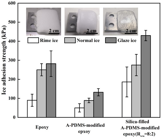 Ice adhesion strength of epoxy, A-PDMS-modified epoxy and nano/microsilica-filled A-PDMS-modified epoxy for three ice types (rime ice, normal ice and glaze ice) at −10 °C. The insets are photographs of rime ice, normal ice and glaze ice. The scale bar is approximately 2 cm, and the error bar is one standard deviation.