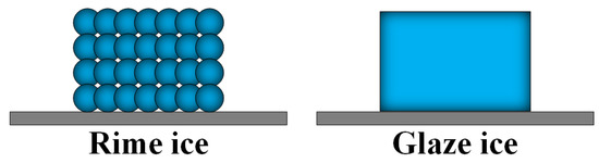 The formation of three types of ice are described as follows. Substrates were coated, ultrasonically cleaned in acetone, and then weighed before icing. The substrates were placed in a refrigerator at the desired temperature (−10 °C). When the temperature was stable, a freeze drizzle was sprayed on the substrates by a spray gun at a specified pressure (600 kPa for rime ice, 300 kPa for normal ice, 80 kPa for glaze ice). The water was taken from an ice-water mixture at an initial temperature of 1~2 °C. When the thickness of the ice reached approximately 1 cm on a 4 cm × 3 cm iced area, the icing process was finished, and the substrates with rime ice were weighed. Rime ice is rough and opaque, formed by supercooled drops rapidly freezing on a sub-zero surface. Glaze ice is transparent and homogeneous and resembles that of a beverage ice cube in appearance. Normal ice is semi-transparent, between the transparency of glaze ice and rime ice. Then, the substrate with ice was bolted to the rotor. The ice adhesion strength tests for the 3 types of spray ice were the same as those for the mould ice described in Section 2.5.