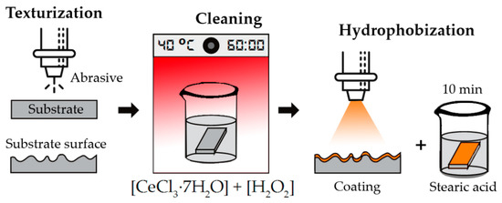 Following the above procedure, the textured and cleaned samples were immersed into a vessel containing a mixture of 50 mL distilled water, 2 g heptahydrated cerium (III) chloride (CeCl3-7H2O), and 3 mL hydrogen peroxide (H2O2) (Sigma-Aldrich Química SL, Madrid, Spain) at 40 °C for 1 h [30]. After this time, the samples were introduced into a second vessel containing a 0.03 M solution of stearic acid in ethanol for 10 min at room temperature (see scheme of Figure 3). Finally, the samples were removed from the solution, cleaned, and dried following the same strategy as in the previous case without the intermediate drying stage.