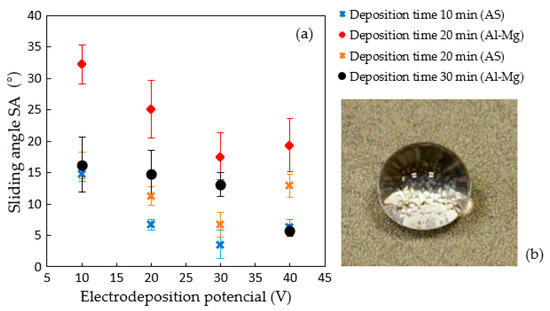 (a) Sliding angle (SA) of 50 µL water drops on Al-Mg and AS substrates subjected to electrodeposition with cerium chloride and myristic acid at different voltages (0.3 mA/cm2) for 10, 20, and 30 min. (b) Image of water drop placed on a treated AS substrate (30 V and 10 min).