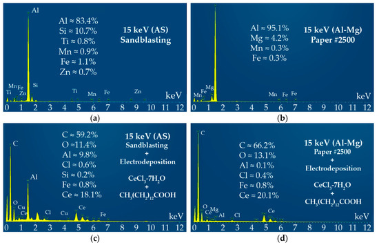 Energy-dispersive X-ray spectroscopy (EDX) spectra of (a) sandblasted AS substrate, (b) sanded Al-Mg substrate, (c) treated AS substrate after electrodeposition (cerium chloride and myristic acid) at 30 V for 10 min, and (d) treated Al-Mg substrate after electrodeposition at 40 V for 30 min.