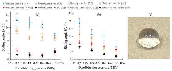 SA of 50 µL water drops on Al-Mg and AS substrates sandblasted at different pressures from 0.2 to 0.5 MPa for 5, 10, and 15 s and immersed in solutions of (a) cerium nitrate and (b) cerium chloride. (c) Image of water drop placed on a treated Al-Mg substrate sandblasted at 0.4 MPa for 15 s.