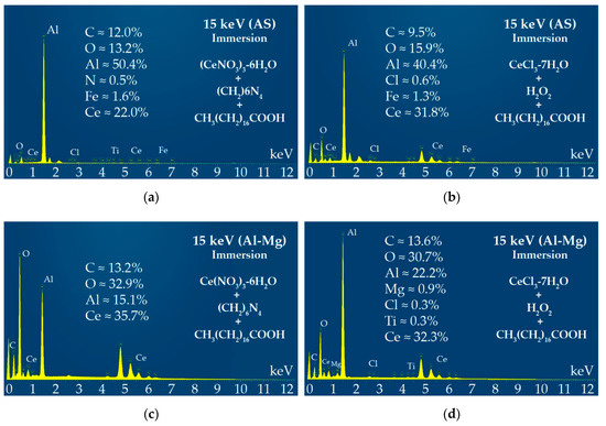 We also studied the elemental chemical composition by EDX for the same substrates analyzed in Figure 9, and the obtained spectra are shown in Figure 8. Unlike for the electrodeposited samples, the EDX spectra for all the immersed samples reveal a high signal for aluminium. This points to a thin or heterogenous coating. This issue is more noticeable for the AS samples (Figure 9a,b) because the presence of Al exceeds 40%. This might explain the worse results obtained for this substrate in comparison with the Al-Mg alloy. In the case of the Al-Mg alloy samples (see Figure 9c,d), the cerium signal is dominant, and this points to a more homogeneous coating. For the rest of the elements detected, their concentrations are compatible with the reagents used in the protocol.