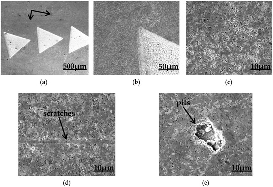 - The wear forms of the non-textured polished specimen mainly include abrasive wear and contact fatigue wear generated under alternating contact stress. The wear forms of the surface of the triangular, triangular groove, and semicircular ring textured specimens are mainly abrasive wear and more or less adhesive wear, and cavitation pits are observed on the surface of the triangular groove and semicircular ring specimens.
