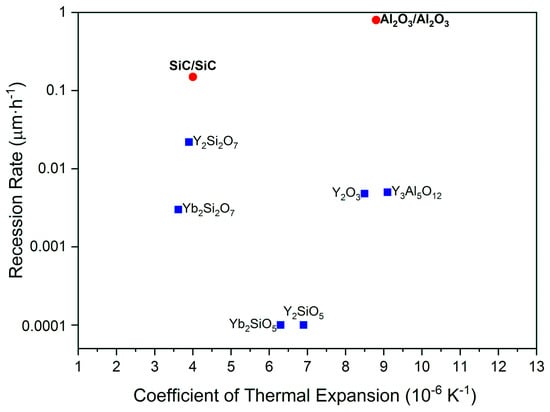 This water vapor recession can be addressed by coatings using highly corrosion-resistant materials (so-called environmental barrier coatings (EBCs)). Many interesting materials have been tested in high velocity and high-temperature and water vapor environments. The recession rates and coefficients of thermal expansion of most of the EBC materials and CMCs of interest in this study are summarized in Figure 1. The recession rate and the thermal expansion coefficient (TEC) is plotted for different materials and the values for two CMC materials are given, an SiC/SiC and an alumina-based Ox/Ox composite. Additionally, Gd2Zr2O7 (CTE = 10.6 × 10−6·K−1) was considered and was shown to have the lowest recession rate among pyrochlore materials successfully used for thermal barrier coating (TBC) application [6,7]. Generally, suitable EBC materials should have low corrosion rates and TECs close to the used CMC.