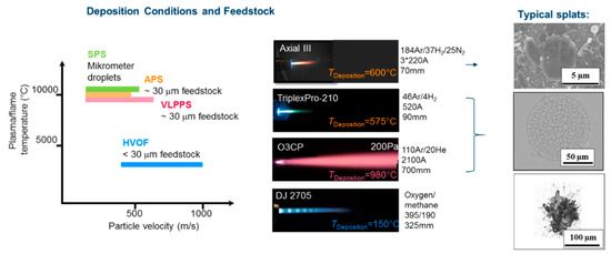 Characteristics of the 4 investigated thermal spray processes (Axial III used for SPS, TriplexPro210 for APS, O3CP for VLPPS, Dj2700 for HVOF) showing plume temperatures and particle velocities, photos of the plumes plus conditions used (process gases, current in case of plasma processes, and stand-off distances), and photos of typical splats.
