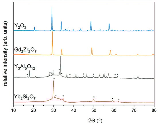 XRD measurements of Y2O3, Gd2Zr2O7, Y3Al5O12 and Yb2Si2O7 coatings in the as-sprayed state, peaks of secondary phases are marked with *.