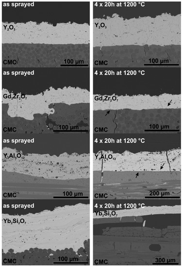 Due to the highest crystallinity, the condition D with hydrogen and long stand-off distance (condition D) was used for further studies and coatings on C/SiC substrates were prepared. In Figure 10 SEM micrographs of the coatings in the as-sprayed condition and after annealing for 12 h at 1350 °C. First of all, the coating is also after the heat-treatment well-adherent. This indicates that the TEC mismatch (see Equations (2) and (3)) between coating and substrate seems to be not extremely detrimental (although the material would fit even better to Ox/Ox CMC substrates). In addition, also the phase transformation at 850 °C and the strongly anisotropic expansion of Y2SiO5 [36] obviously does not significantly affect coating integrity.