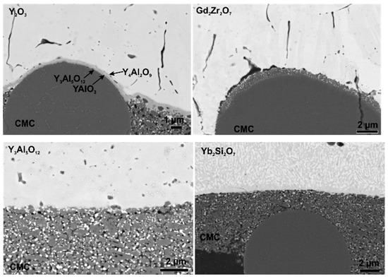 SEM images of the coating substrate interface of Y2O3, Gd2Zr2O7, Y3Al5O12 and Yb2Si2O7 coatings on Ox/Ox CMCs after thermal treatment.