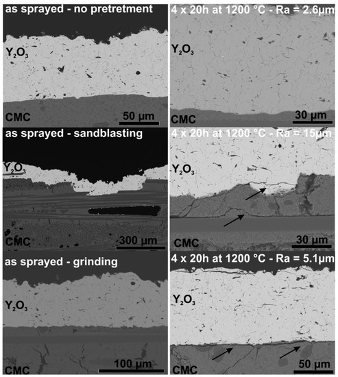First, samples of the Al2O3/Al2O3 CMC were mechanically treated to increase the surface roughness. Some samples of the Al2O3/Al2O3 CMC were ground, others were grit-blasted. Both methods were able to increase the surface roughness from 2.6 µm to 5.1 µm and 15 µm, respectively. The samples were coated and subsequently furnace cycled for 4 × 20 h at 1200 °C. SEM images of cross-sections of the as-sprayed Y2O3-coatings as well as furnace cycled samples are shown in Figure 6. The results show that the mechanical pre-treatment damaged the ceramic substrate to such an extent that even Y2O3 coatings failed. Unlike in the study of Gérendas et al. [32], mechanical pre-treatment was not able to achieve sufficient coating adhesion on this CMC.