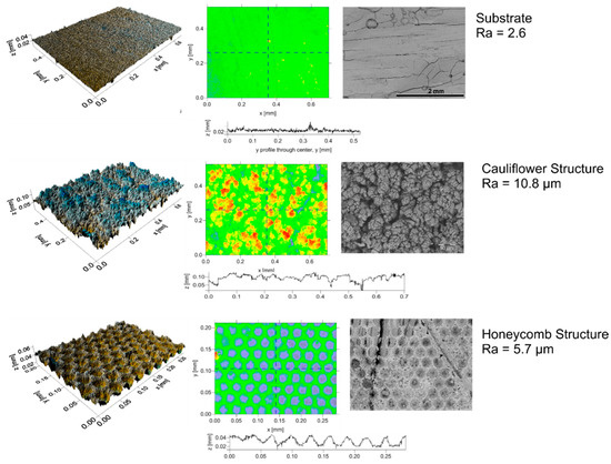 Laser ablation was used for surface structuring without damaging of the substrates. The positive effect of laser surface structuring of Al2O3/Al2O3 CMCs on coating adhesion was recently demonstrated by Gatzen et al. [23]. Two different structures were chosen for this study: honeycomb and cauliflower structure. Both structures are illustrated in Figure 7.