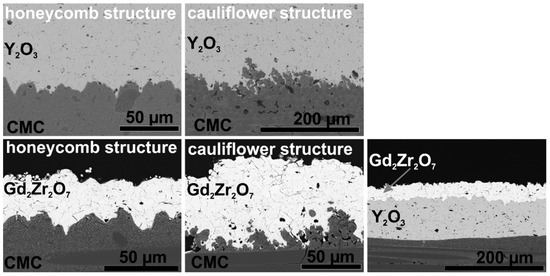 After structuring the samples were coated with Y2O3 and Gd2Zr2O7. SEM images of the coated and thermally cycled samples are shown in Figure 8. Both coatings could infiltrate the voids in between the substrate structure. The surface structures, especially the cauliflower structure, allow interlocking of the coating. After thermal cycling no cracks or delamination occurred in the Y2O3 coating-substrate-system. This shows that in contrast to grit-blasting and grinding, laser structuring of the CMC does not weaken the ceramic matrix. Furthermore, after thermal cycling of the laser-structured Gd2Zr2O7 coated samples, the coating-substrate interface shows no delamination cracks. This is a significant improve, compared to the coating on untreated substrates. Although the energy release rate is high in these coatings with high mismatch (see Equations (2) and (3)), the laser structuring of the samples proofed to be beneficial for the coating adhesion (e.g., the critical energy release).