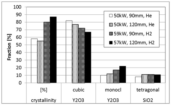 According to Figure 1 Y2SiO5 has an excellent water vapor resistance and is therefore considered as appropriate EBC material [34,35]. In this investigation only rather hot APS spraying conditions are investigated for this material. The density of all the coatings manufactured by the investigated conditions (see Table 2) has been rather high, more interesting is the phase content which shows remarkable differences (see Figure 9). Compared to the He as secondary gas, hydrogen increased the plasma enthalpy which leads to higher substrate temperatures (750°C) and increases the amount of crystallization. The comparable amount of SiO2 in all coatings might indicate no significant differences in the silica loss during spraying (although the amorphous content is not considered).